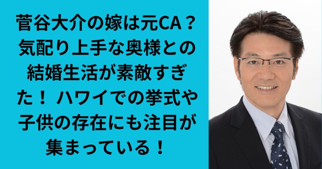 人気アナウンサーとして活躍を続ける菅谷大介さん。 その柔らかい語り口と誠実な人柄で、多くの視聴者から愛されています。 そんな菅谷大介さんですが、プライベートでは元CAの嫁と結婚しているという噂があるようです。 ハワイでの挙式や、子供の存在など... -