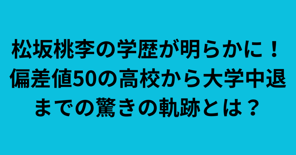 魅力的な演技力で多くのファンを魅了する松坂桃李さん。 そんな松坂桃李さんですが、学生時代はどのような生活を送っていたのでしょうか。 松坂桃李さんは、神奈川県立茅ヶ崎高等学校を卒業後、産業能率大学に進学したものの中退したそうです。 そんな松坂... -
