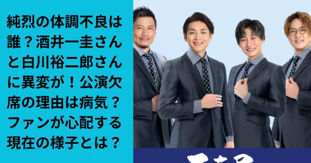 人気ムード歌謡グループとして幅広い年代に支持されている純烈。 バラエティ番組やステージでも活躍しているグループですが、最近では体調不良によるメンバーの公演欠席が 相次いで報道されています。 特に注目されているのは、団長・酒井一圭さんと白川裕... -