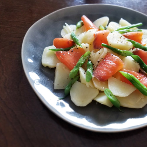 • 夕食:全粒パスタ(または玄米)+トマト・ほうれん草・豆類入りミネストローネ+サーモンのグリル+アボカドスライス