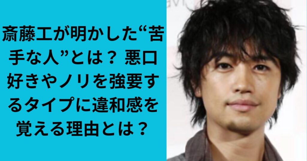 斎藤工が明かした“苦手な人”とは? ドラマや映画で圧倒的な存在感を放ち、幅広いファン層に支持されている俳優の斎藤工さん。 そんな斎藤さんですが、実はある「タイプの人」に苦手意識を感じていることを過去のメディアで明かしてい ます。 今回は、そん... -